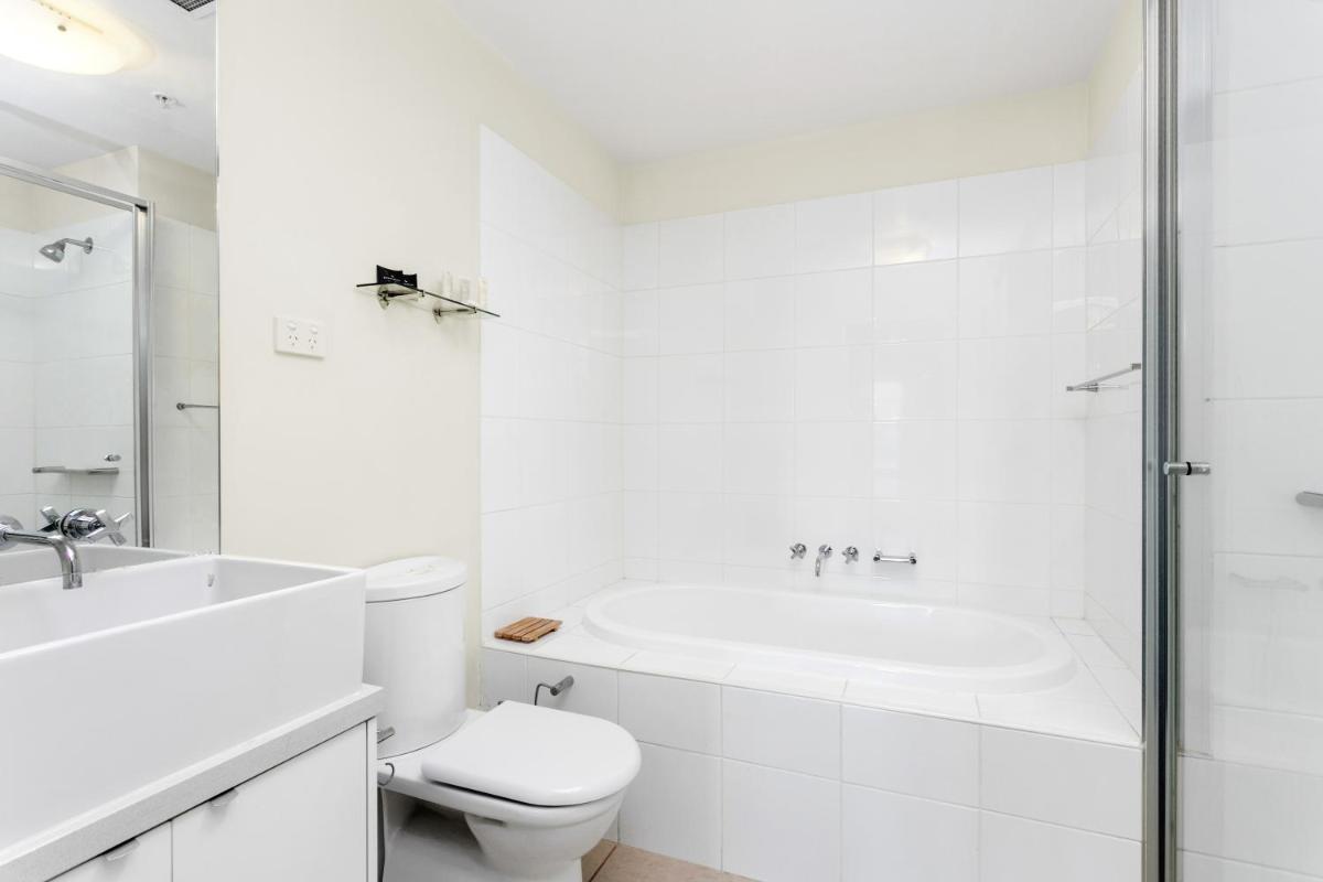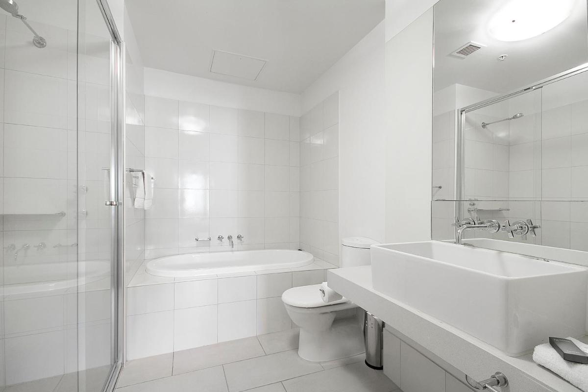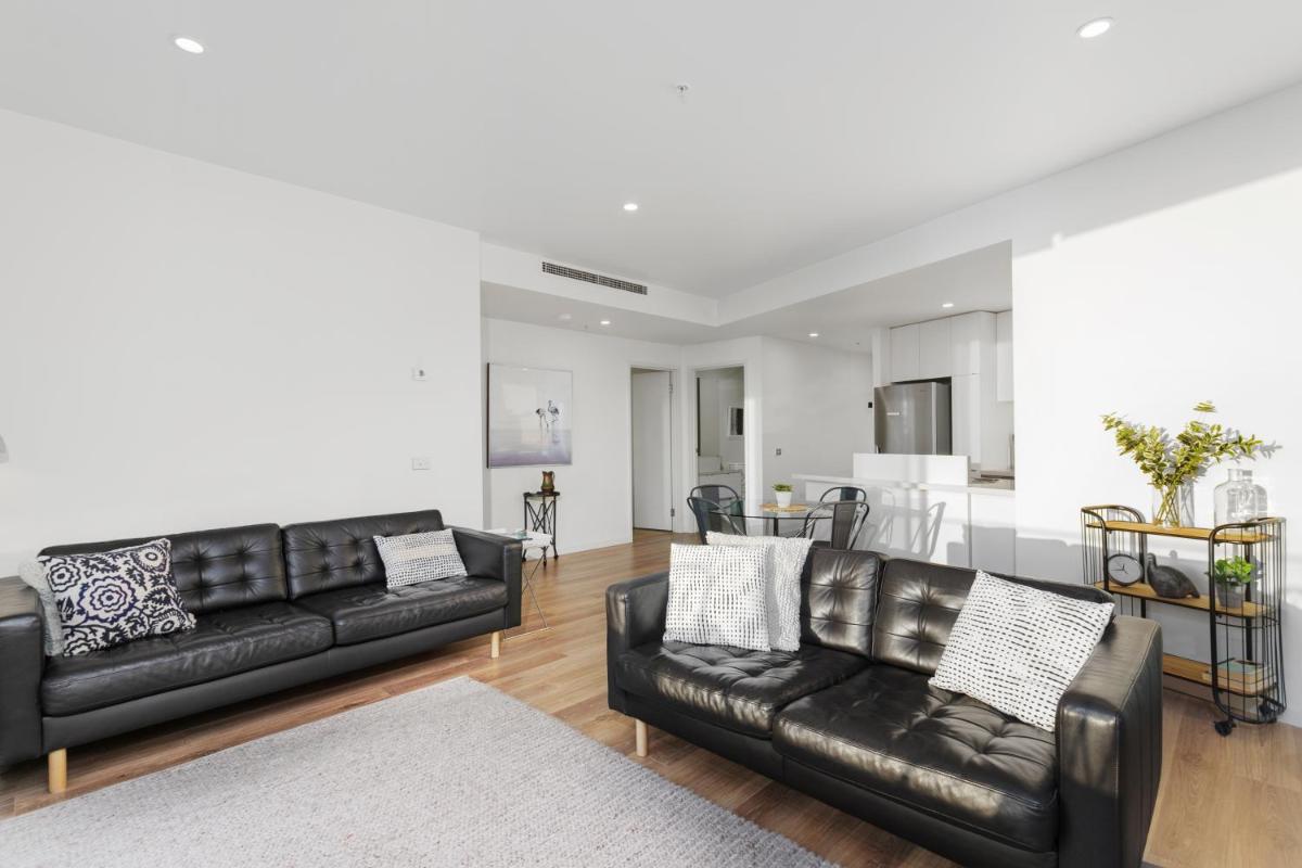 Photos highlight the spacious interiors: open-plan living areas, fully equipped kitchens, and floor-to-ceiling windows. Balconies showcase views of the Yarra and Melbourne skyline. The pool and sauna are shown under natural light, while the gym captures the property’s modern, functional design. Riverfront shots and Docklands high-rises complete the visual mood.